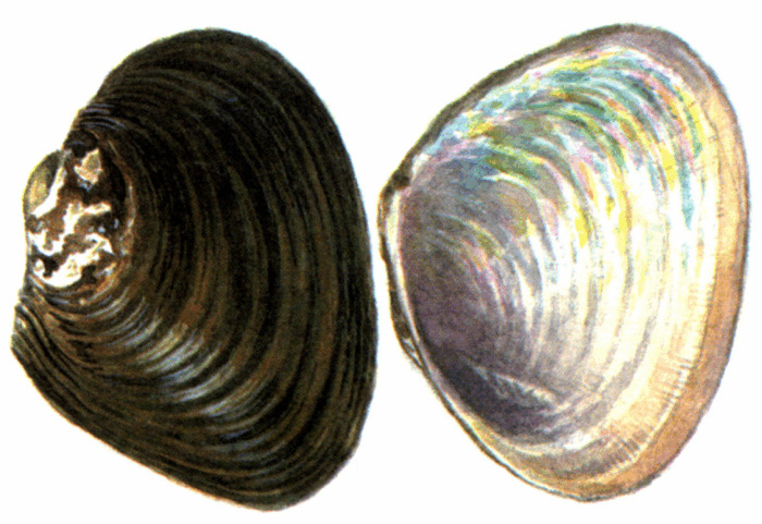 Раковина массивная, неправильно-овальная, вздутая, умеренно толстостенная. Ее максимальная длина может достигать 13 см. Спинной край прямой, заметно наклонен вперед. Задняя часть спинного края приподнята в виде невысокого крыла. Задний край на границе нижней трети высоты створки образует тупой угол. Брюшной край слегка закругленный. Лигамент обычно закрыт краями створки. Самая задняя точка раковины лежит ниже середины ее высоты. Задний килевой перегиб слабо выражен. Макушки широкие, сдвинуты ближе к переднему краю раковины. Макушечная скульптура представлена выгнутыми валиками, заканчивающимися перед линией килевого перегиба. Периостракум часто неровный, окрашен в желто-бурый, зеленовато-коричневый цвет. Замок полностью редуцирован, но у крупных особей имеется рудимент заднего зуба. Мускульные отпечатки широкие, неглубокие. По внутреннему краю вентральной части раковины идет широкая матовая полоса.