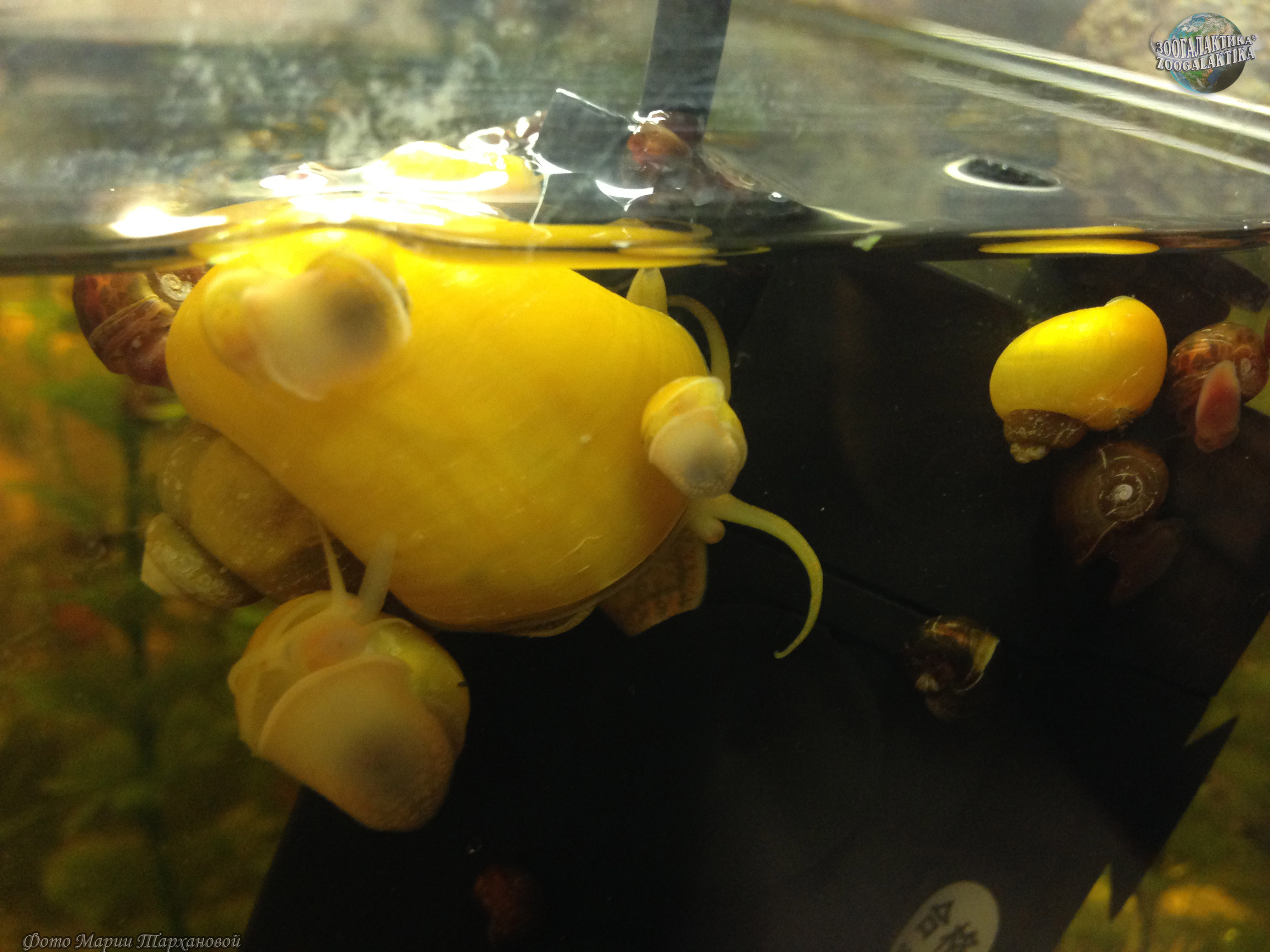 Ампуллярии появились в Европе в прошлом веке. Привезли их из Южной Америки. Этот вид широко распространен в странах тропического пояса и обитает в стоячих или медленнотекущих водоемах - прудах, болотах, реках. Эти улитки привычны к низкому качеству воды. Внешне ампуллярии напоминают прудовиков. Естественный цвет их спирально завитой раковины бледно-коричневый, с широкими темными концентрическими полосами, но при разведении в неволе наиболее популярными оказались альбиносы желтого цвета. В случае опасности или при неблагоприятных условиях ампуллярия использует роговую крышечку, которая подобна дверце, закрывающей раковину, когда улитка прячется в нее. Эти моллюски - амфибии, способные выходить за переделы воды и хорошо приспособленные к такому образу жизни. Даже икру, спасая ее от водных хищников, они откладывают на суше.