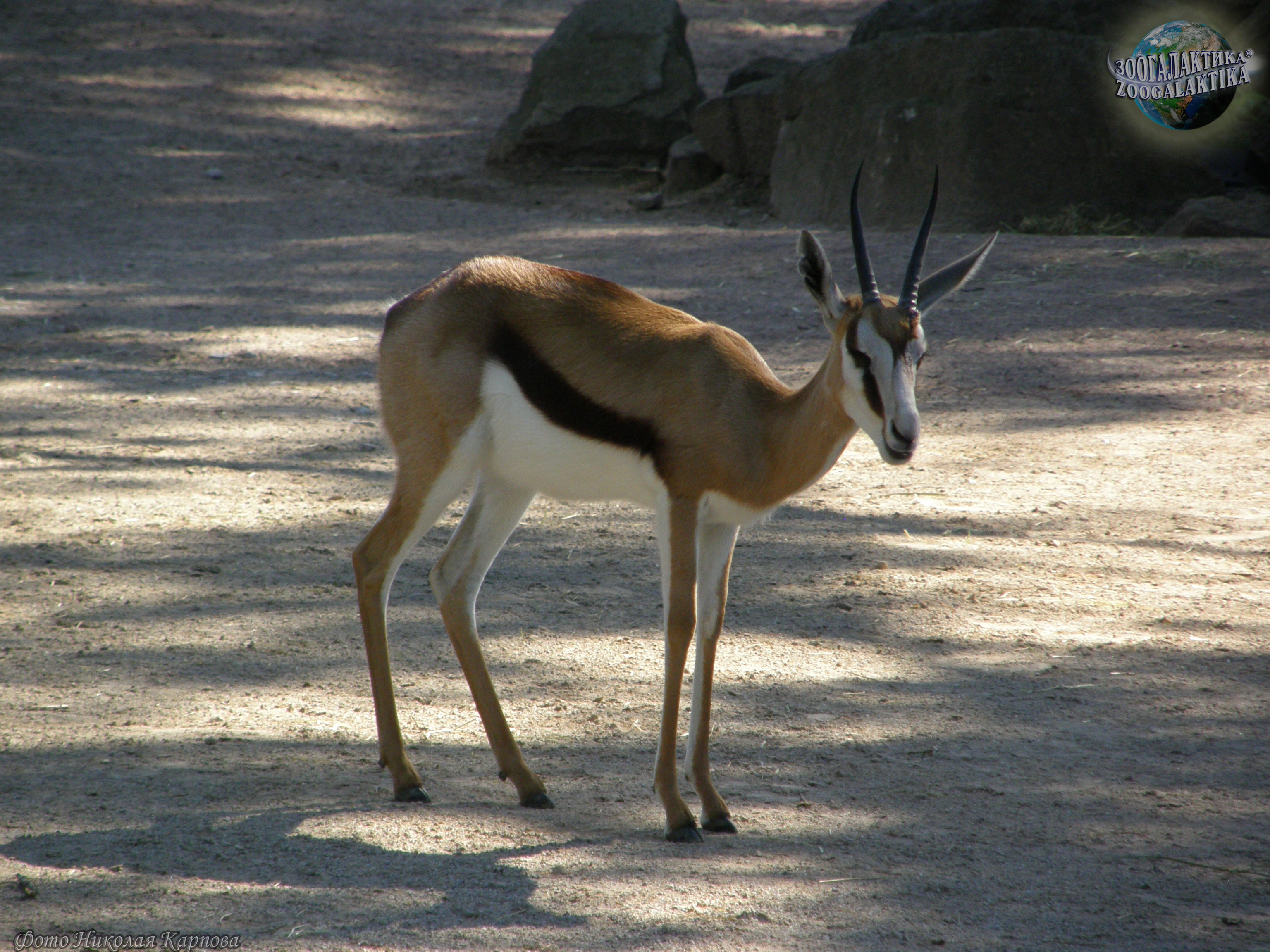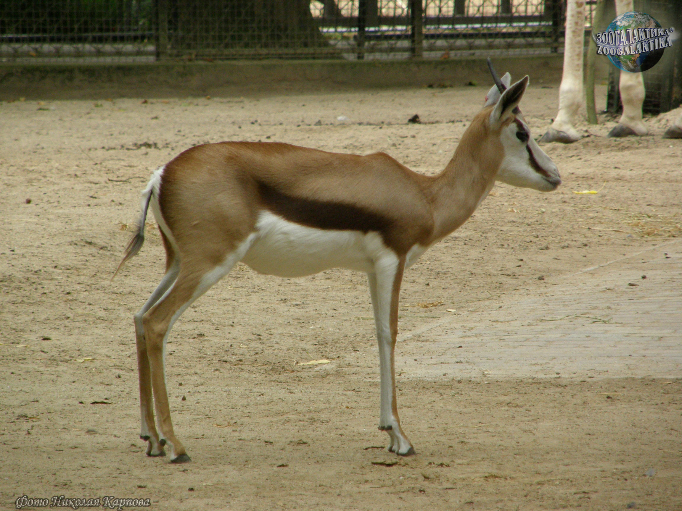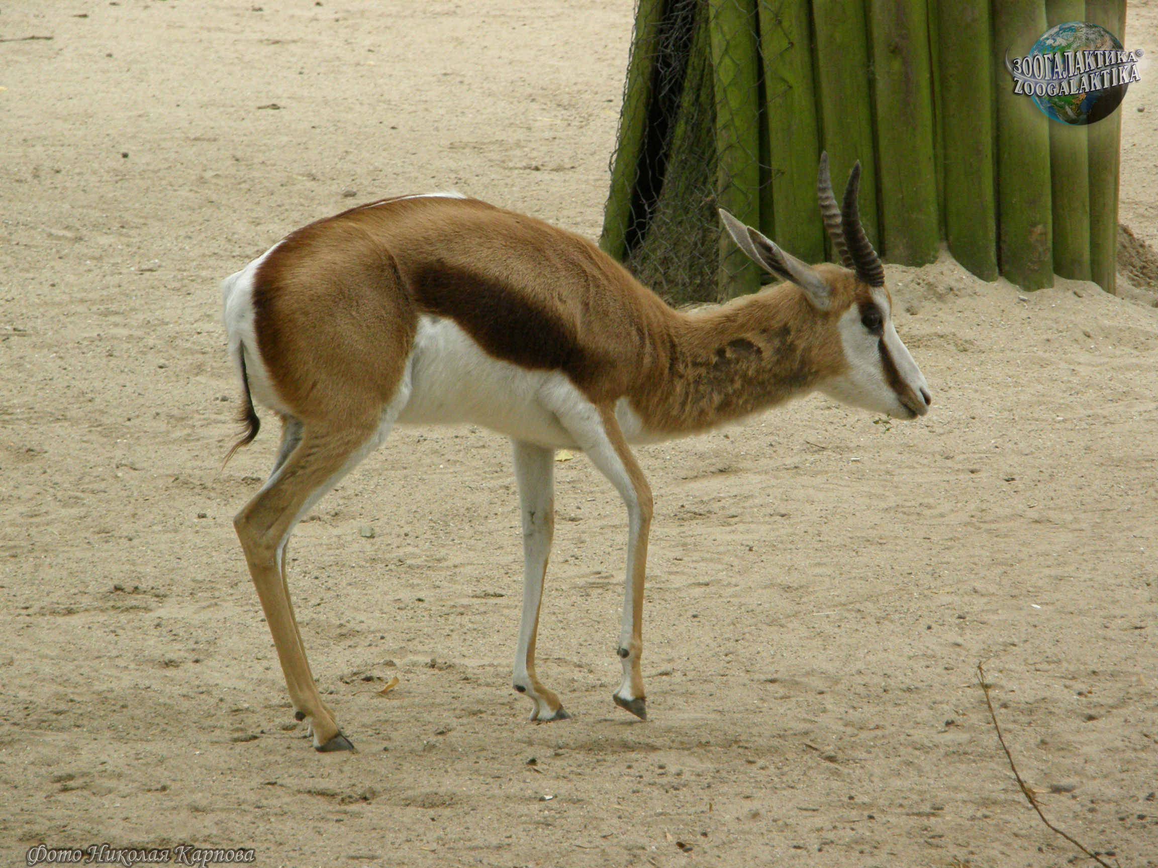 Спрингбок (Antidorcas marsupialis) - некрупная газель весом 30-45 кг при высоте в холке 70-90 см. Лировидные рога есть как у самцов, так и у самок. Самая замечательная особенность спрингбока — обширная продольная кожная складка на спине, начинающаяся с середины спины и доходящая почти до корня хвоста. Изнутри она покрыта длинным ослепительно-белым мехом, кожа ее богата железами. Когда животное спокойно, края складки сомкнуты, и о ее существовании можно и не подозревать. Однако, завидев опасность, спрингбок начинает подпрыгивать на месте, отталкиваясь одновременно всеми ногами, без видимых усилий, точно резиновый мяч. Эти прыжки могут достигать 2 м в высоту. Во время прыжка животное низко опускает голову, собирает все копыта в одну точку и круто выгибает спину - от этого края кожной складки широко расходятся и выстилающий ее белый мех начинает сверкать ослепительным пятном. Спрингбок делает обычно несколько таких прыжков, и для всех обитателей саванны, в том числе, конечно, и других спрингбоков, они служат сигналом об опасности.