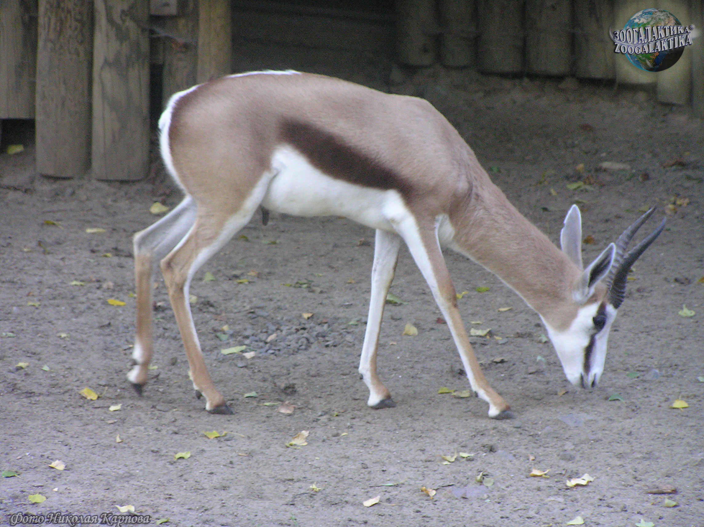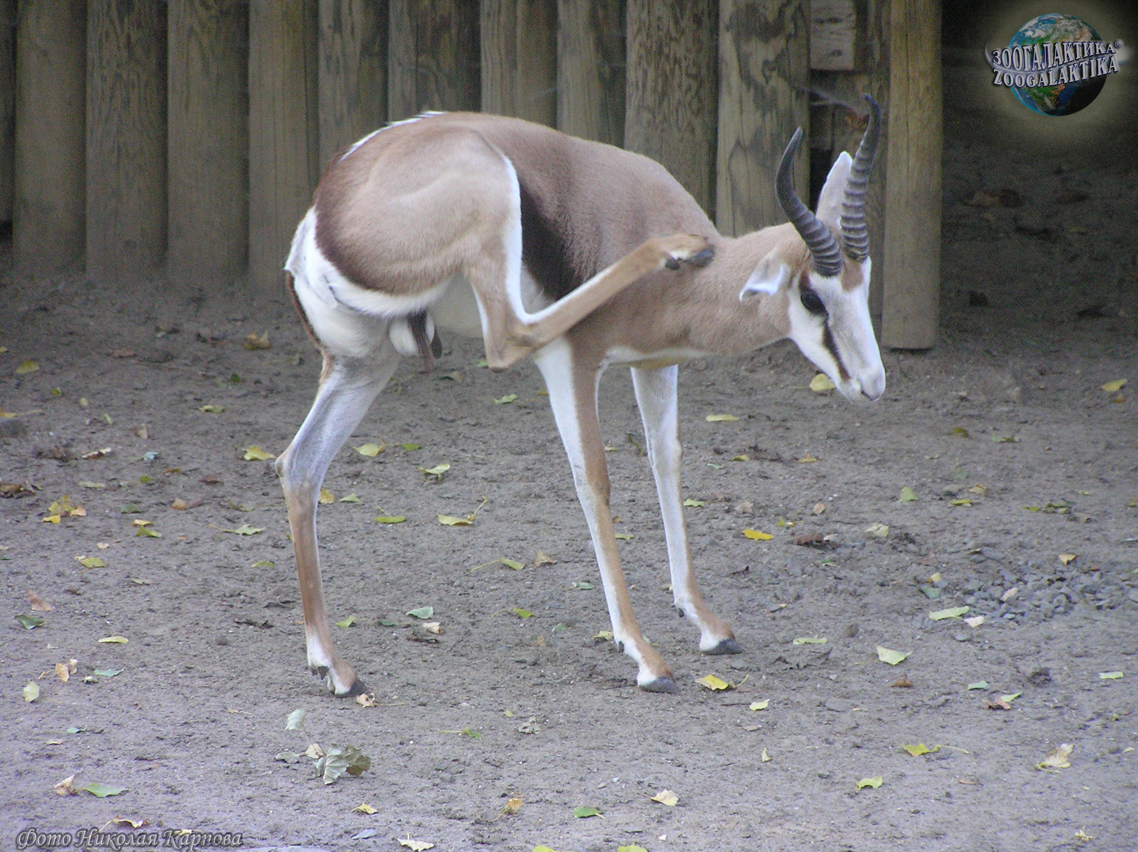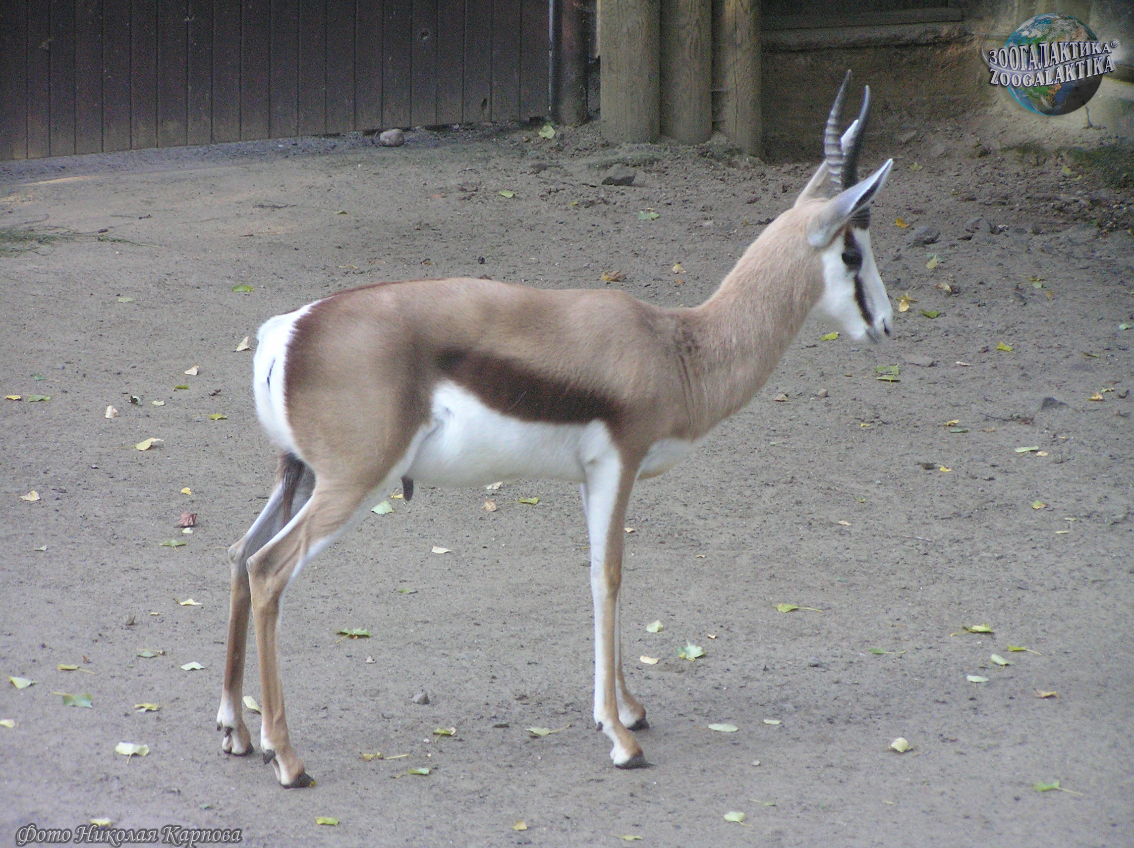 Спрингбок (Antidorcas marsupialis) - некрупная газель весом 30-45 кг при высоте в холке 70-90 см. Лировидные рога есть как у самцов, так и у самок. Самая замечательная особенность спрингбока — обширная продольная кожная складка на спине, начинающаяся с середины спины и доходящая почти до корня хвоста. Изнутри она покрыта длинным ослепительно-белым мехом, кожа ее богата железами. Когда животное спокойно, края складки сомкнуты, и о ее существовании можно и не подозревать. Однако, завидев опасность, спрингбок начинает подпрыгивать на месте, отталкиваясь одновременно всеми ногами, без видимых усилий, точно резиновый мяч. Эти прыжки могут достигать 2 м в высоту. Во время прыжка животное низко опускает голову, собирает все копыта в одну точку и круто выгибает спину - от этого края кожной складки широко расходятся и выстилающий ее белый мех начинает сверкать ослепительным пятном. Спрингбок делает обычно несколько таких прыжков, и для всех обитателей саванны, в том числе, конечно, и других спрингбоков, они служат сигналом об опасности.
