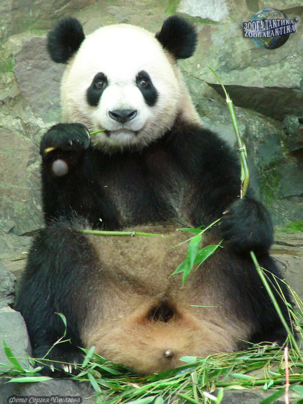 Большая панда, или знаменитый бамбуковый медведь (Ailuropoda melanoleuca) - один из самых «раскрученных» зверей в мире. Удивительная черно-белая окраска и сходство с огромной плюшевой игрушкой делает его легко узнаваемым и очень популярным. О систематическом положении панды ученые спорят очень давно: ее относили то к енотам, то к медведям, то выделяли в отдельное семейство. У панды массивная голова с короткой и широкой мордой, коренастое тело и - в отличие от других медведей - довольно длинный, до 12 см, хвост. Это довольно крупное животное: его вес может достигать 130 кг, а длина тела - почти 2 метров. Широкие, волосатые, закругленные в нижней части ступни панды с сильными когтями при ходьбе не полностью опираются на землю. На подошвах и в основании каждого пальца хорошо развиты голые подушечки, облегчающие удерживание гладких стеблей бамбука. Удивительной особенностью этих животных является дополнительный, противопоставленный «палец» на руке известный как большой или «предбольшой» палец панды (на самом деле он является видоизменённой костью запястья), позволяющий им управляться даже с самыми тонкими побегами бамбука.