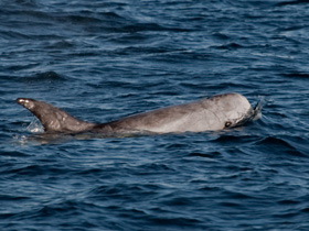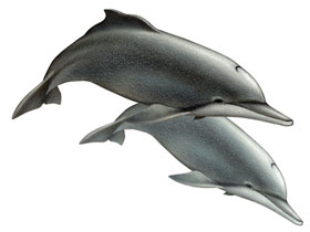 Дельфины (Delphinidae), как и все китообразные, дышат воздухом, периодически всплывая на поверхность, чтобы сделать вдох через единственную видоизмененную ноздрю – дыхало, расположенное на темени. Это же дыхало киты и дельфины используют, чтобы издавать различные звуки. Питаются они преимущественно рыбой и кальмарами, хотя некоторые виды предпочитают креветок и других ракообразных, а косатки поедают также морских черепах, водных млекопитающих и птиц. У большинства дельфинов самцы крупнее самок и у некоторых видов отличаются от них более высоким спинным плавником. Дельфиновые обитают во всех открытых морях и иногда заходят в устья крупных рек. Некоторые виды распространены очень широко, почти всесветно (дельфин-белобочка, косатки), другие более локально. Внешне дельфиновые отличаются в первую очередь выступающим клювом, который четко отграничен от лба. Исключение составляют несколько видов с выпуклым, сферическим лбом. Представители семейства характеризуются присутствием в обеих челюстях довольно значительного числа (от 2 до 250) однородных конических зубов. У некоторых видов семейства кроме конических зубов имеются моляровидные, т.е. близкие по строению к коренным. Спинной плавник у дельфиновых обычно очень низкий, в виде гребня; он скорее серповидный, чем треугольный; если он не загнут, то очень высокий, как у самца косатки.
